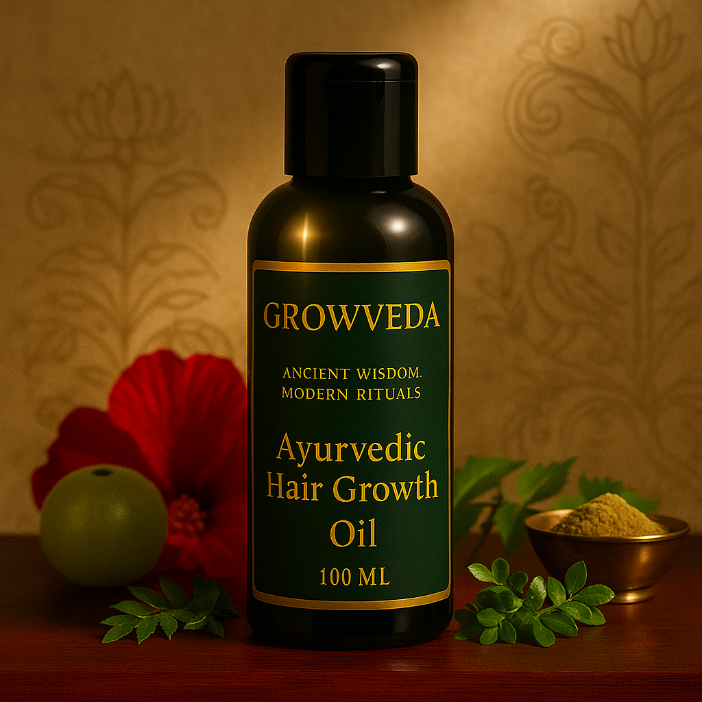 💧 Start your ritual with the Growveda Ayurvedic Hair Oil, a time-tested blend of potent herbs that deeply nourishes your scalp, strengthens hair roots, and improves blood circulation. It reduces hair fall, dryness, and dullness giving your scalp the care it actually craves.